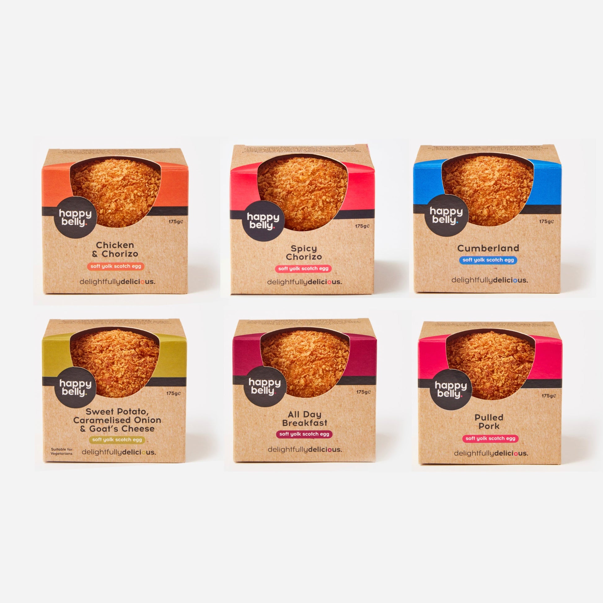 Indulge in ultimate happiness with Happy Belly Ultimate Scotch Eggs. This selection of 6 scotch eggs will surely satisfy your cravings and bring a smile to your face. Don't wait, grab a box and experience the joy of deliciousness!